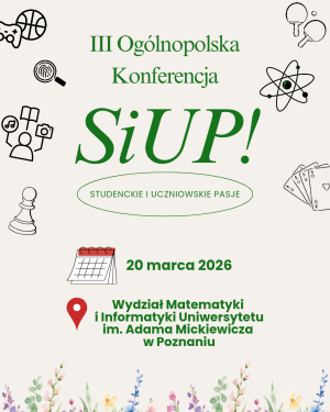 Serdecznie zapraszamy na III edycję Ogólnopolskiej Konferencji SiUP – Studenckie i Uczniowskie Pasje! Wydarzenie odbędzie się w piątek, 20 marca 2026 na Wydziale Matematyki i Informatyki UAM w Poznaniu, więc wracamy do wiosennego terminu konferencji. Tak jak w poprzednich edycjach chcemy gorąco zaprosić uczniów do aktywnego uczestnictwa w tym wydarzeniu. ...